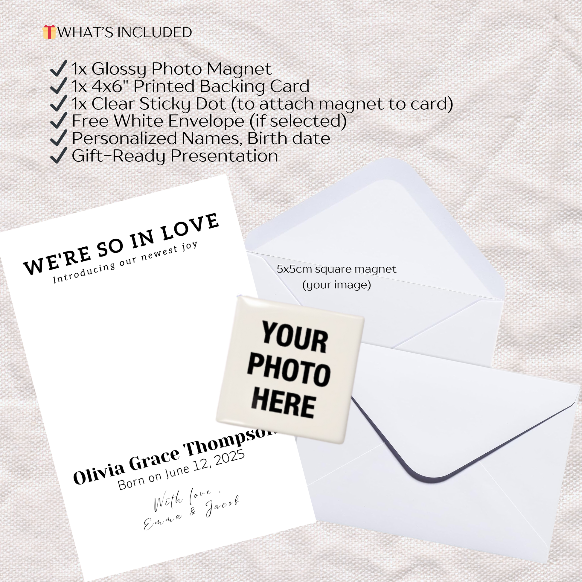 A heartwarming way to share your little one’s arrival with family and friends! This custom photo magnet gift set includes a printed card and everything needed for a lovely presentation.