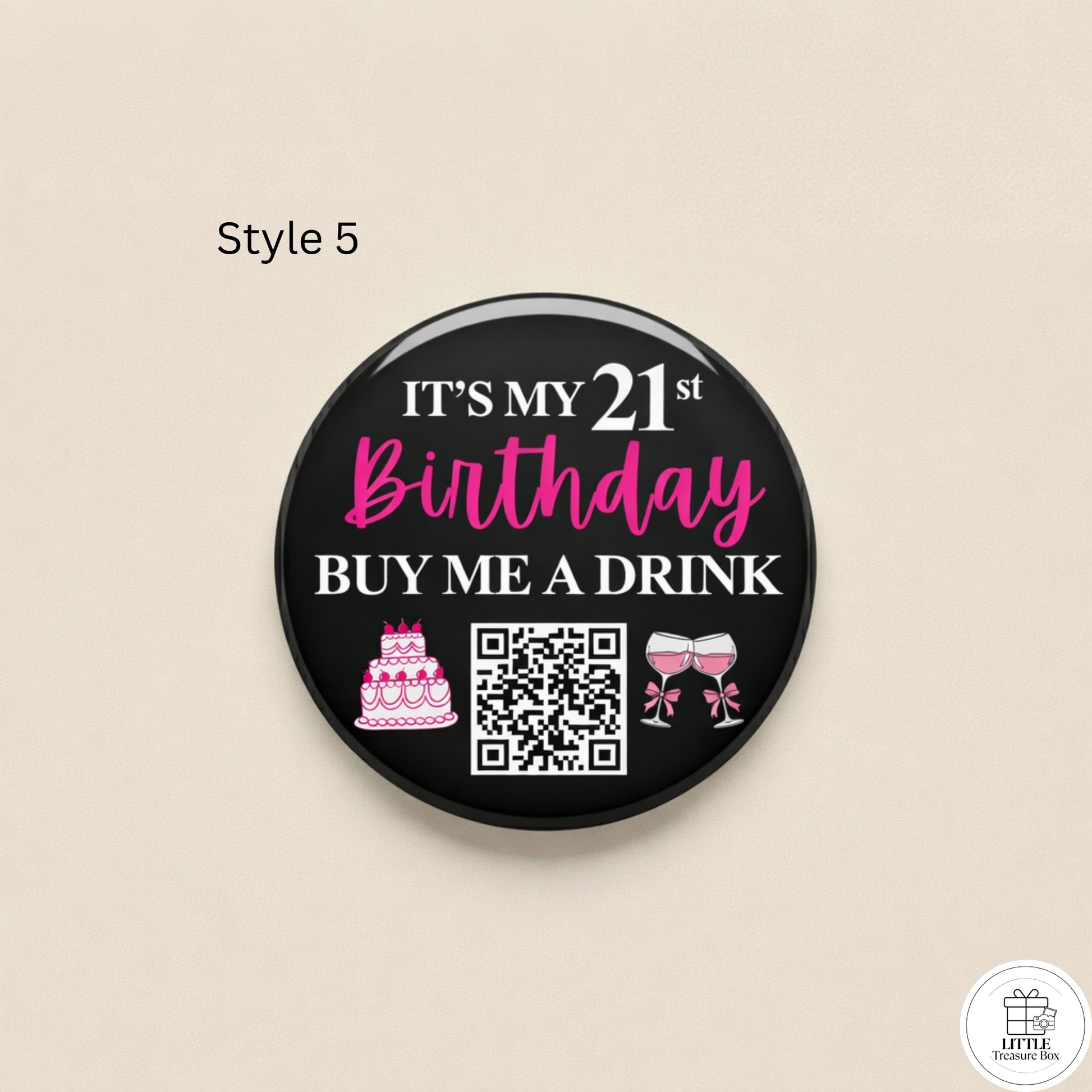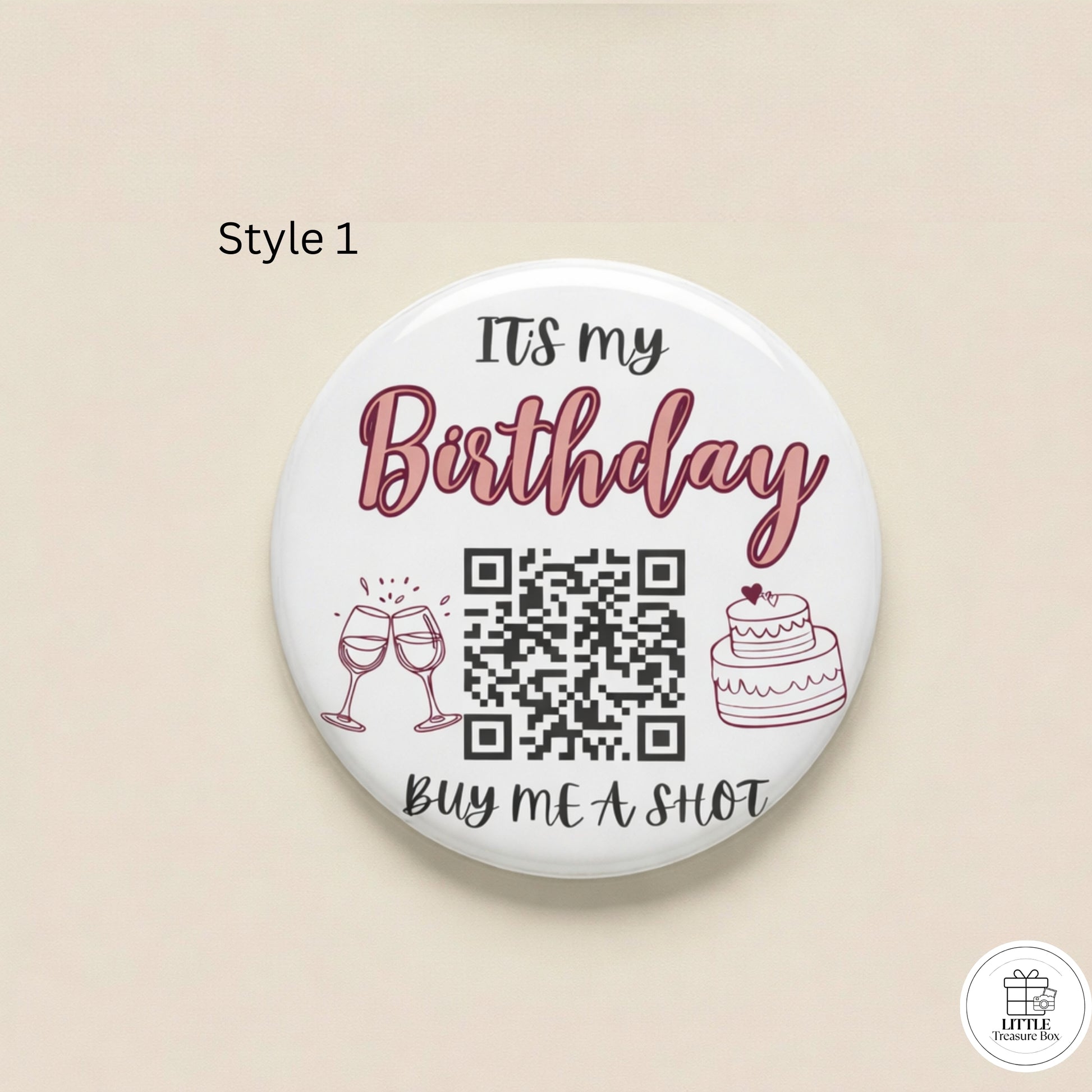 Birthday QR Code Button Pin – Buy Me a Shot Birthday Badge | Custom 58mm Birthday Pin | Party Favor, Bar Crawl, Bachelorette Gift