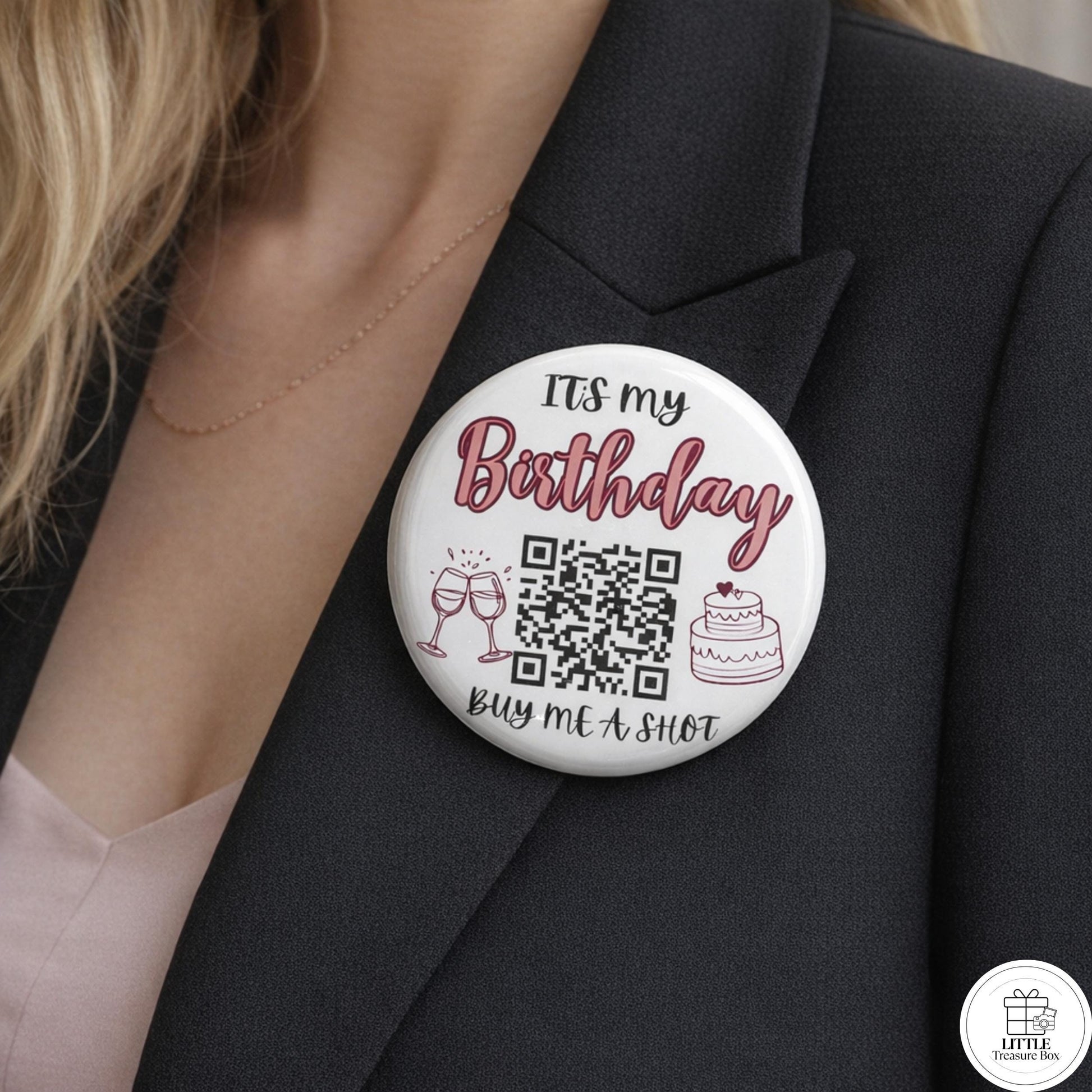 This 2.28" round button pin is eye-catching, lightweight, and easy to wear on dresses, jackets, or bags. Guests simply scan the QR code to send you a drink, tip, or birthday love 💖.