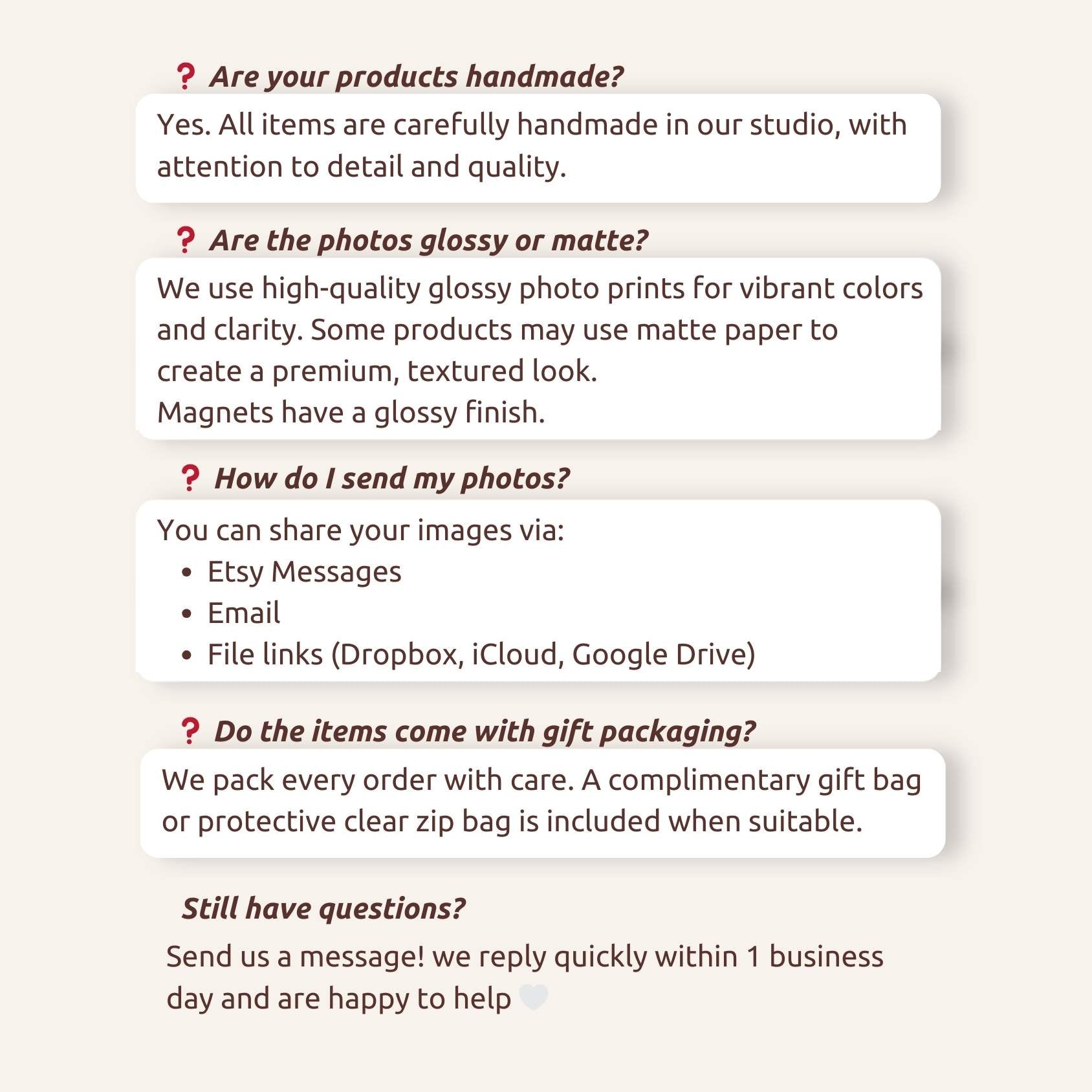 ✅ You can send up to the number of photos that matches your quantity.