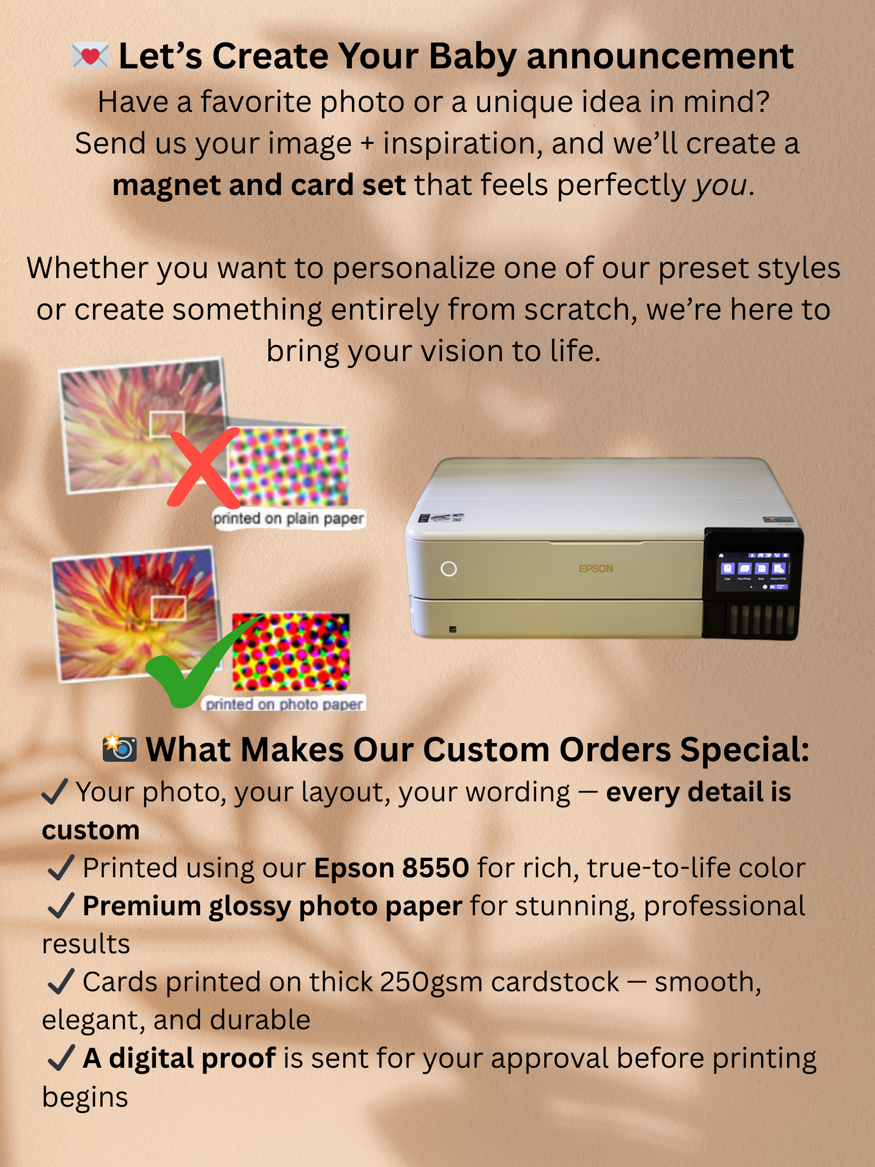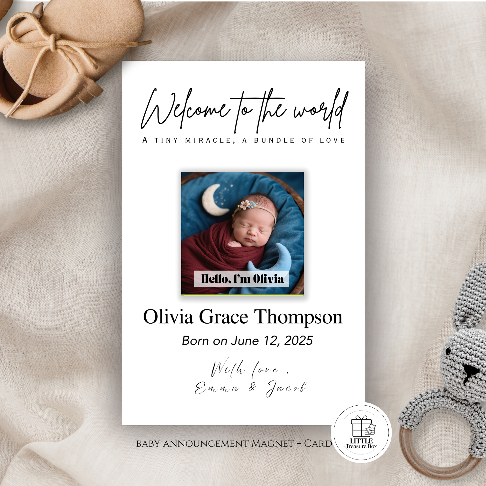 A heartwarming way to share your little one’s arrival with family and friends! This custom photo magnet gift set includes a printed card and everything needed for a lovely presentation.
