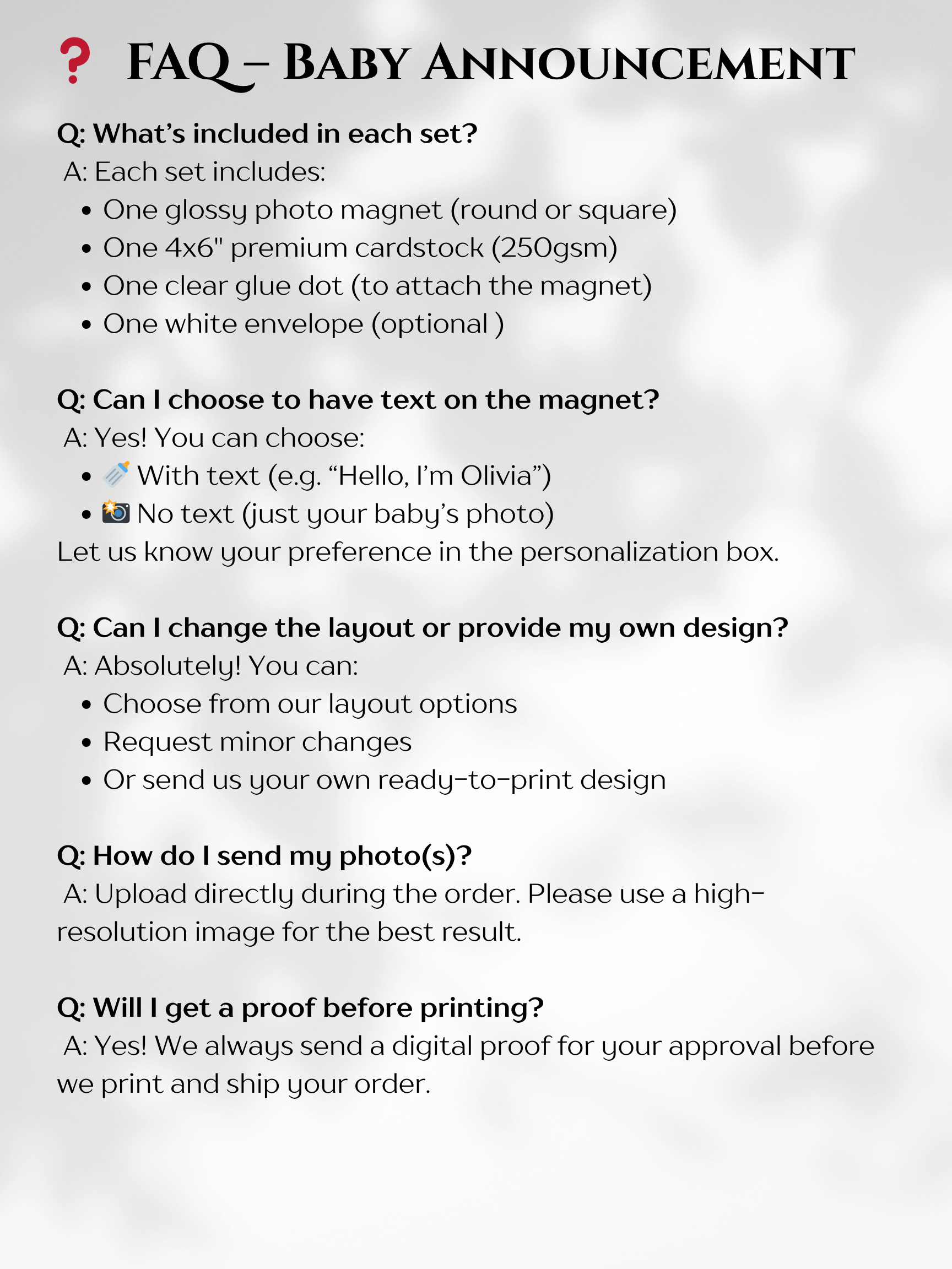“Hello, I’m Olivia” or “Meet Baby Liam – Born Sept 8” - Or choose no text on the magnet (just photo)