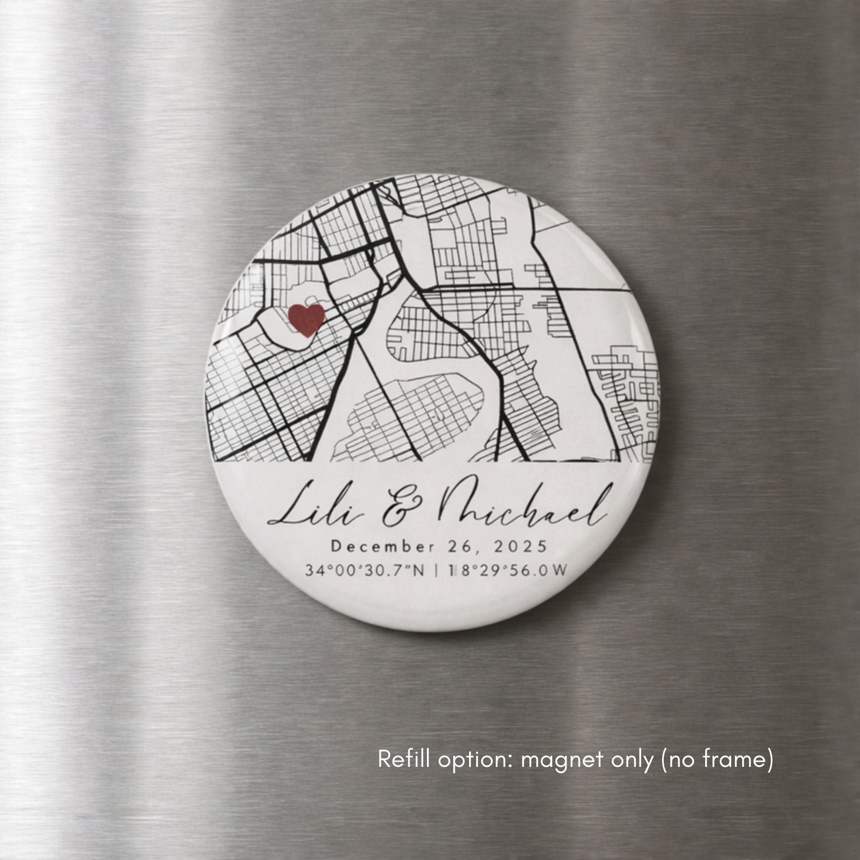 With a clean round design, elegant typography, and a subtle heart marker, this ornament is a timeless keepsake perfect for holidays or year-round display.